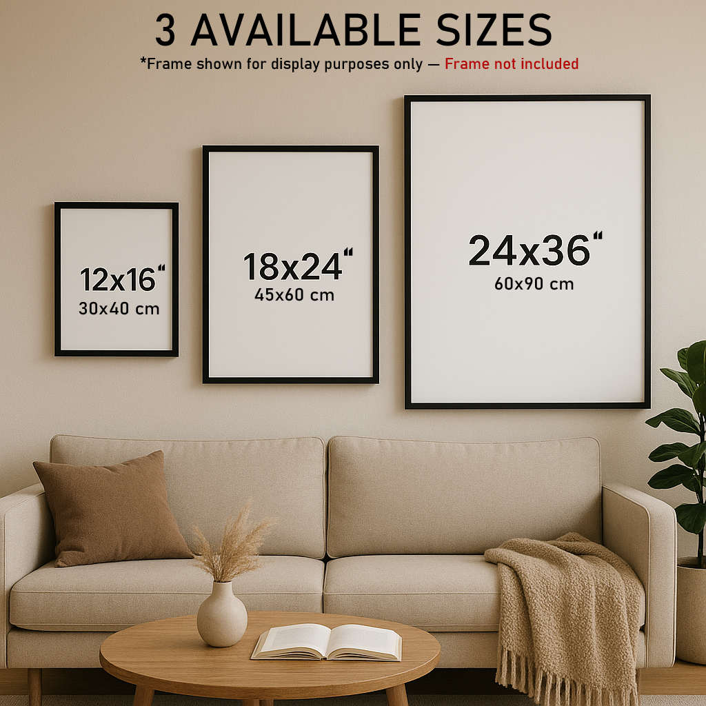 Standard sizes (12×16", 18×24", 24×36") fit readily available frames from Target, IKEA, or custom framers.